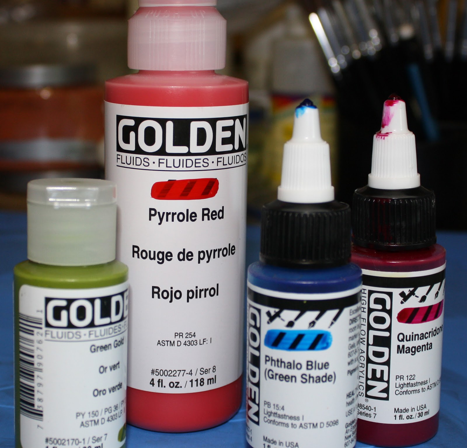 The fluid acrrylics, Golden brand is what I found although there are several brands, combined them with fluid craft acrylic paints to produce these paintings. The golden brand fluid acrylics are intensely pigmented and pourable. The craft acrylics work well although they are not the quality of the artist fluid acrylics, although both are pourable. So other than pigmentation and price, the fluid acrylic paints are similar to craft acrylics in consistency and either can be used together.